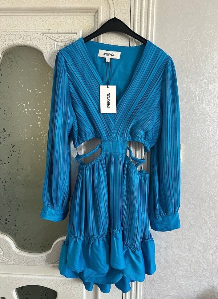 Ürünün bedeni 38 40 uyumludur.Mavi renkli, pilili, V yaka ve askılı kısa elbise. Bel kısmında kesik detayı ve bol kesim ile rahat bir kullanım sunar. Sentetik, yumuşak dokulu kumaştan üretilmiştir.