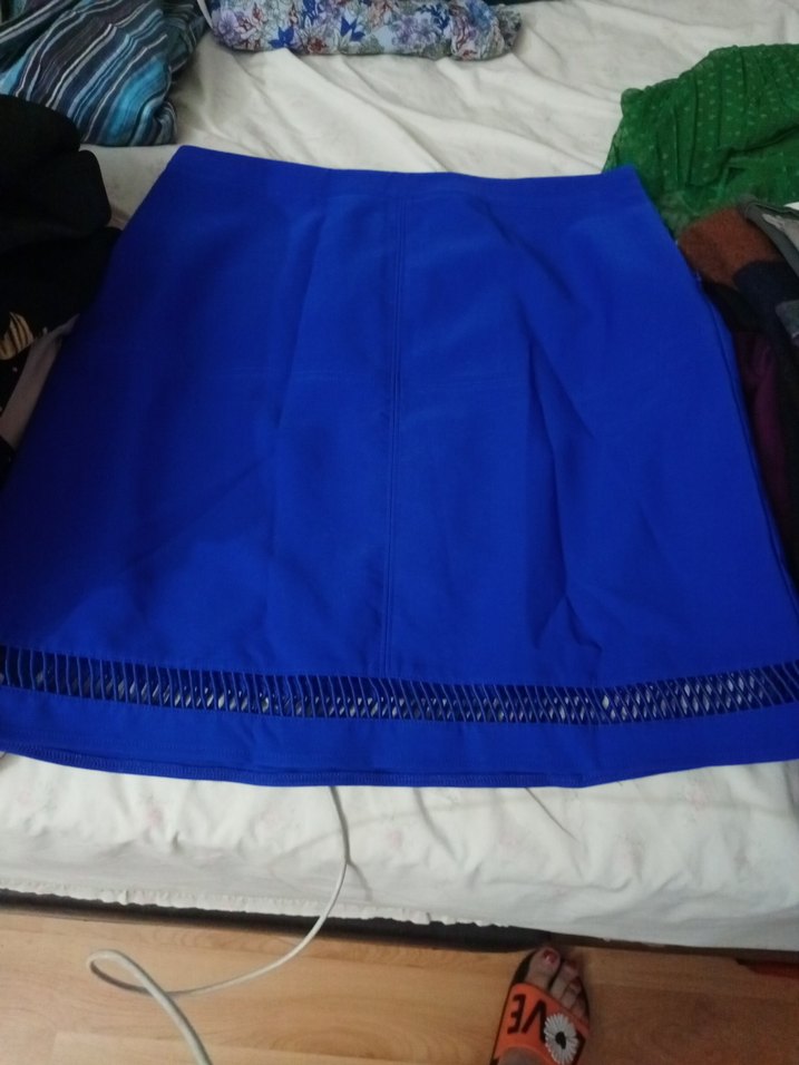 Mavi renkte, pilili ve etek ucu detaylı, sentetik kumaştan yapılmış dar kesim mini etek. Dış mekan kullanımı için uygundur.