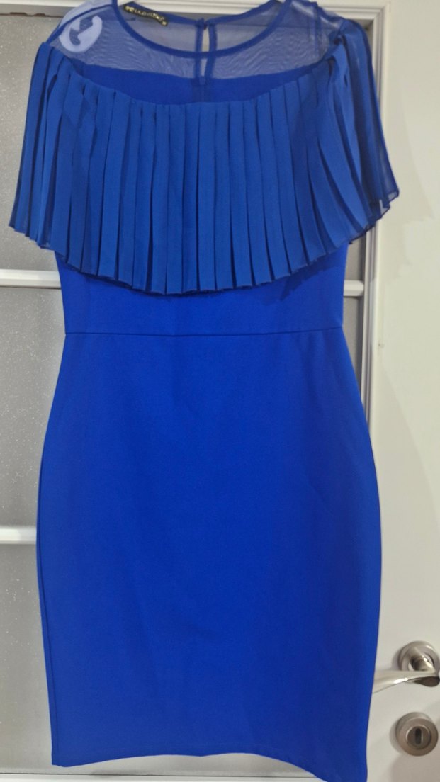 Mavi renkli, straplez yaka ve pilili detaylı, fitted kesim mini elbise. Kolsuz ve modern, minimalist tarzda, ofis için uygun.