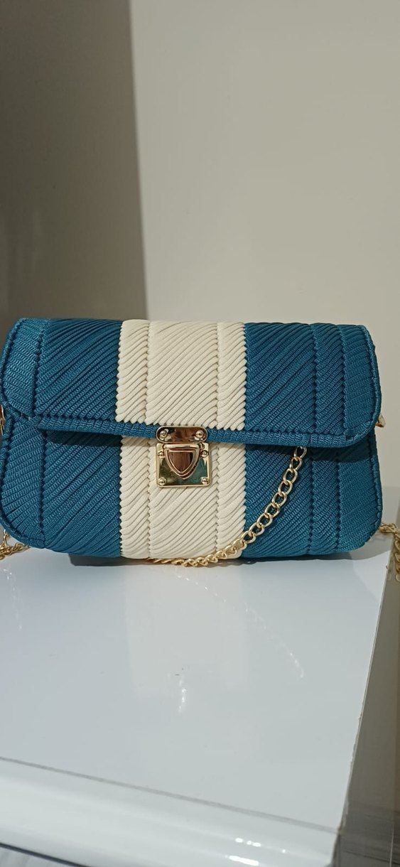 Kadınlar için pilili sentetik kumaştan yapılmış, mavi ve beyaz renklerde renkli batik desenli, altın zincir askılı modern klasik Paris tarzı çanta.