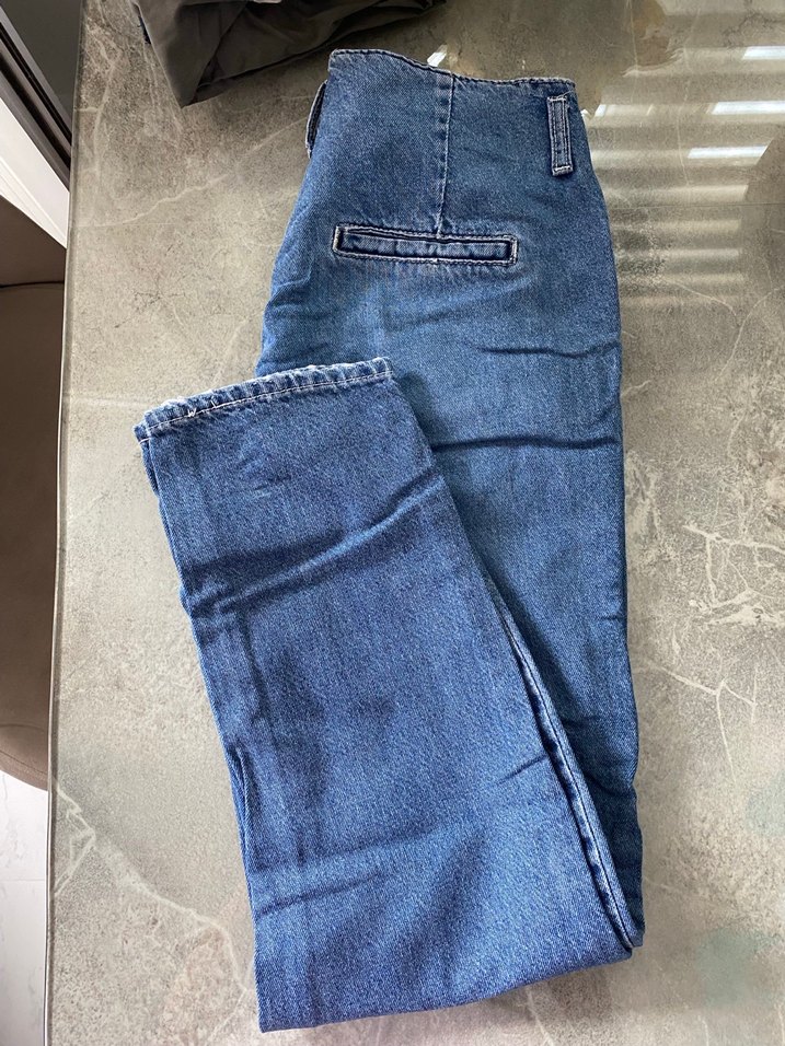 Pilili detaylara sahip, mavi parlak renkte, rahat kesim ve midi boy kadın denim jean, günlük kullanıma uygundur.