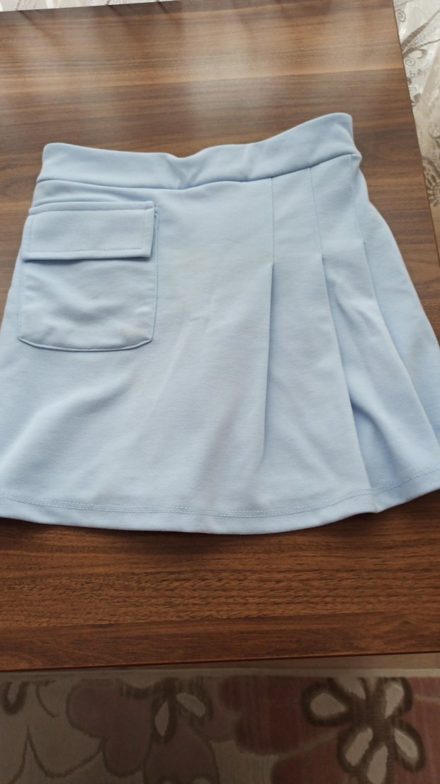Pastel mavi renkte, pilili şort etek. Yumuşak ve sıcak kumaştan, yan cep detayıyla minimalist sokak tarzına uygun.