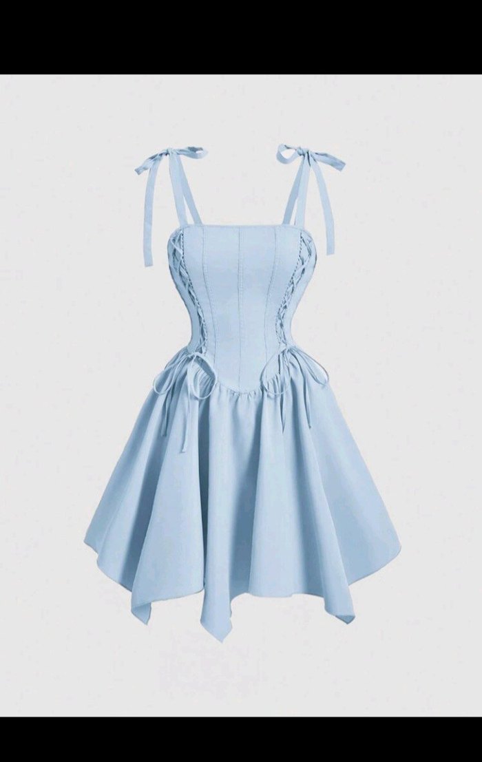Mavi renkte, pilili ve askılı, yumuşak denim kumaştan yapılmış, vücuda oturan mini elbise. Parti için uygun.