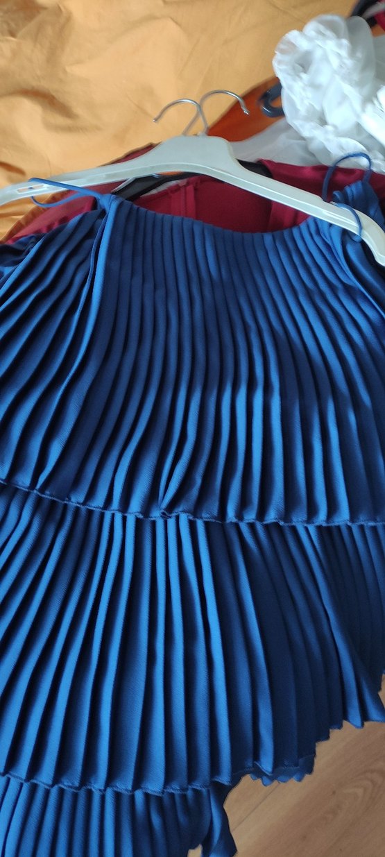 Pilili, uzun ve mavi renkli abiye elbise, tek renk ve suni kumaştan. Kayık yaka ve ince askılı, parti için uygun.