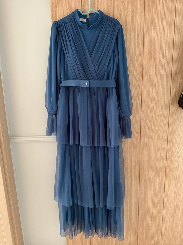 Mavi renkli pilili uzun abiye elbise, yüksek yakalı ve ince kemerli tasarımıyla modern klasik bir şıklık sunar. İnce askılı kollara sahiptir. İki kez kullanıldı,temizdir,herhangi bir sorunu yoktur