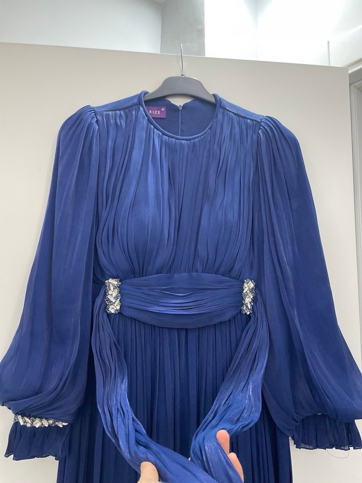 Uzun mavi abiye elbise, pilili detaylara, yuvarlak yakaya ve uzun kollara sahiptir. Gevşek kesimli ve parlak yüzeylidir, düğünler için uygundur. Bel ve manşetlerde süslemeler bulunur.