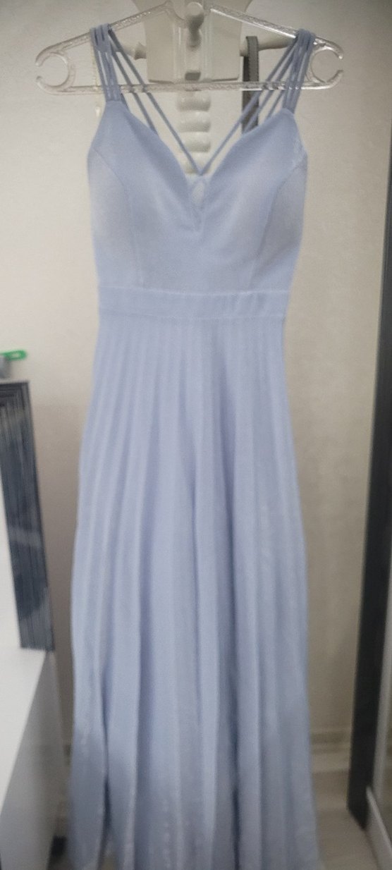 Pastel mavi renginde, V yakalı ve kolsuz, pilili uzun etekli klasik modern abiye elbise. Düğünler için uygun şık bir model.