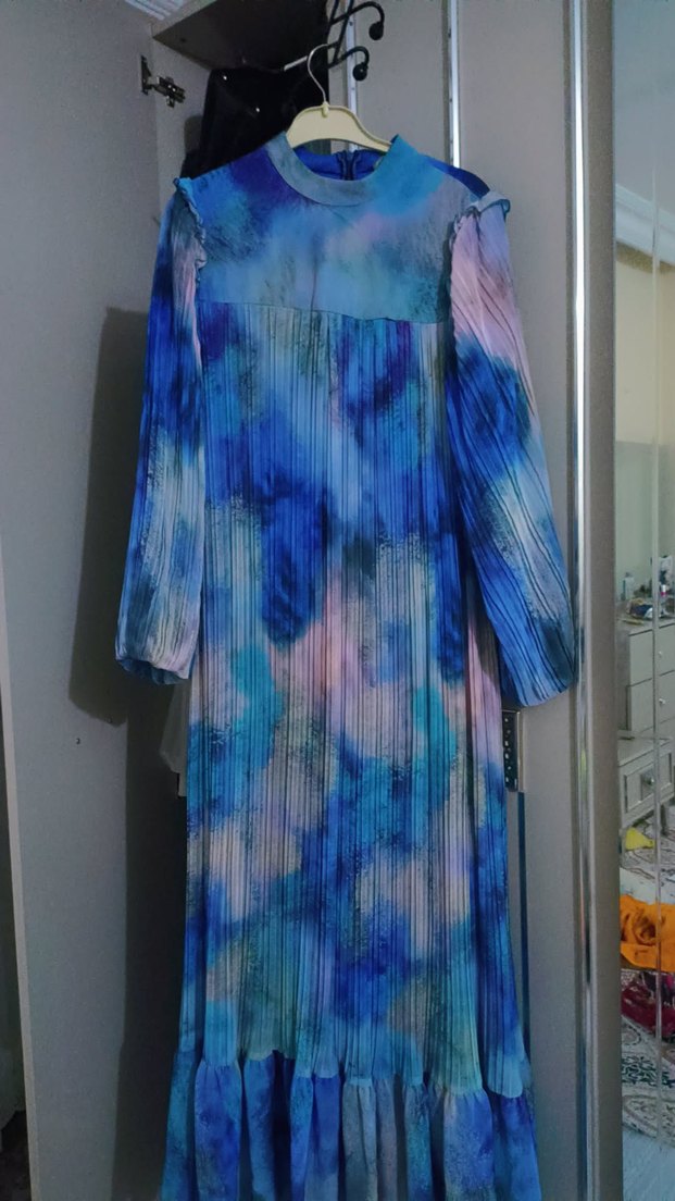 Yüksek yakalı, uzun kollu, bol kesim kadın elbisesi, pilili tasarım ve pastel mavi bağlama desenli, bohem ve avangart tarzda.