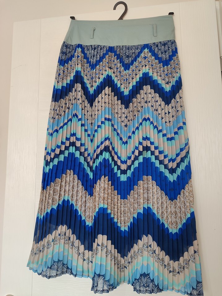 Mavi ve gri tonlarda bağlama desenli, pilili uzun etek. Sentetik kumaştan, bol kesim ve bohem tarzda, açık hava için uygun. marka temsilidir.
