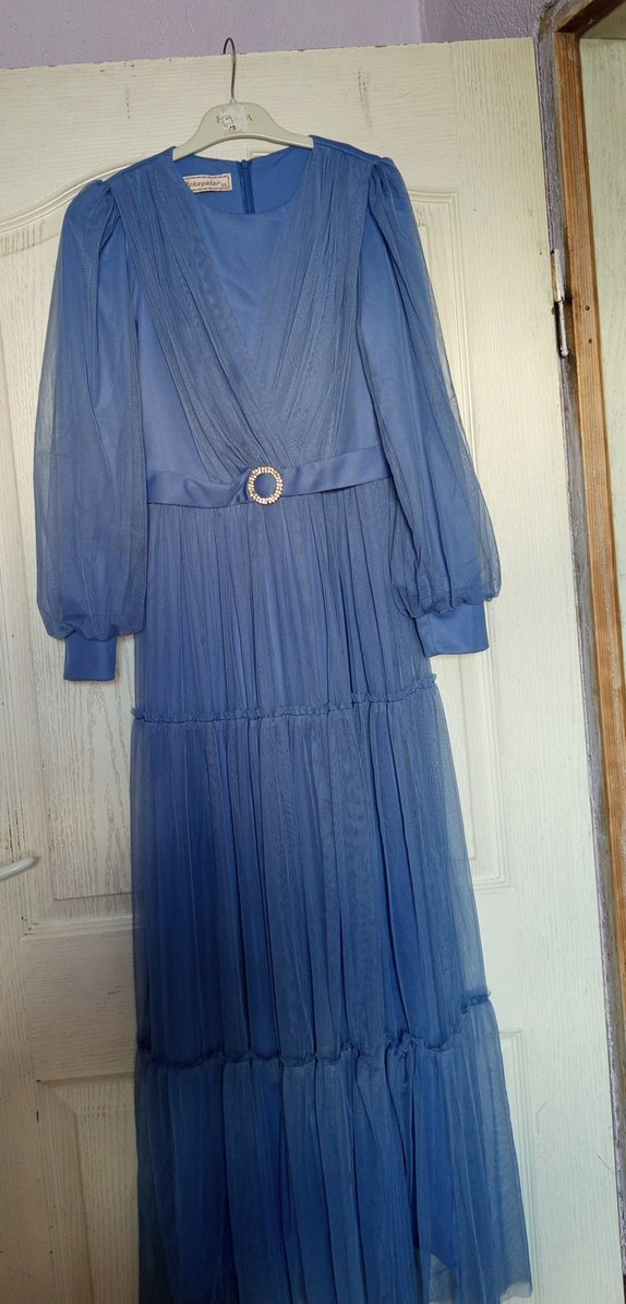 Mavi renkte, pilili ve bol kesim uzun abiye elbise. Kayık yaka ve askılı kollara sahip, vintage esintili modern klasik tarzda. Düğün için uygun, kemer tokası detaylı.