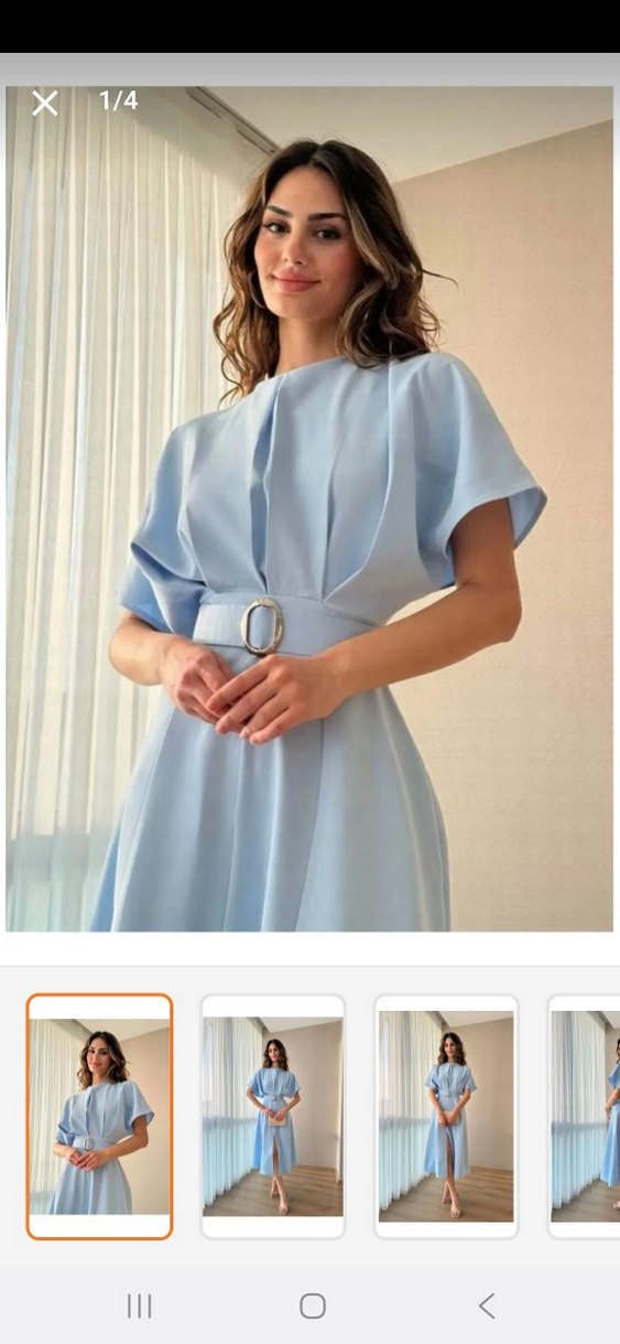 Mavi renkte, ve kısa kollu, pilili detaylara sahip uzun kadın elbisesi, yumuşak sentetik kumaştan, tamboy 124cm bel 38cm