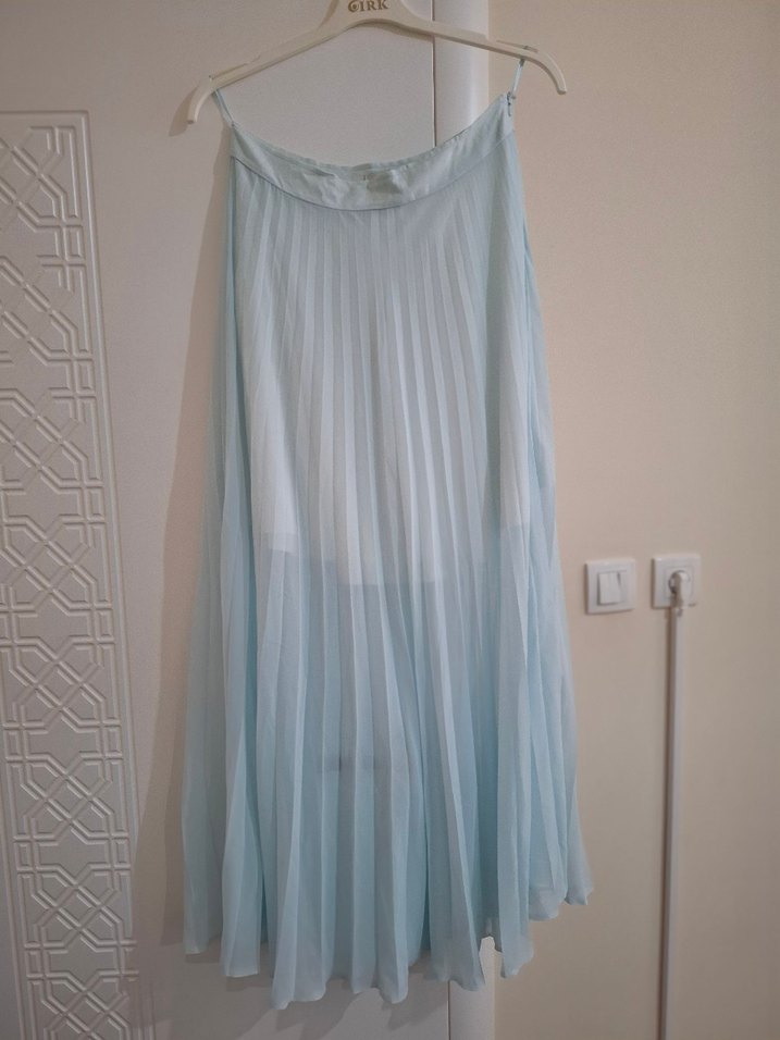 Pastel mavi renkte, pilili ve bol kesim uzun kadın eteği, yumuşak sentetik kumaştan yapılmıştır, günlük kullanım için uygundur.
