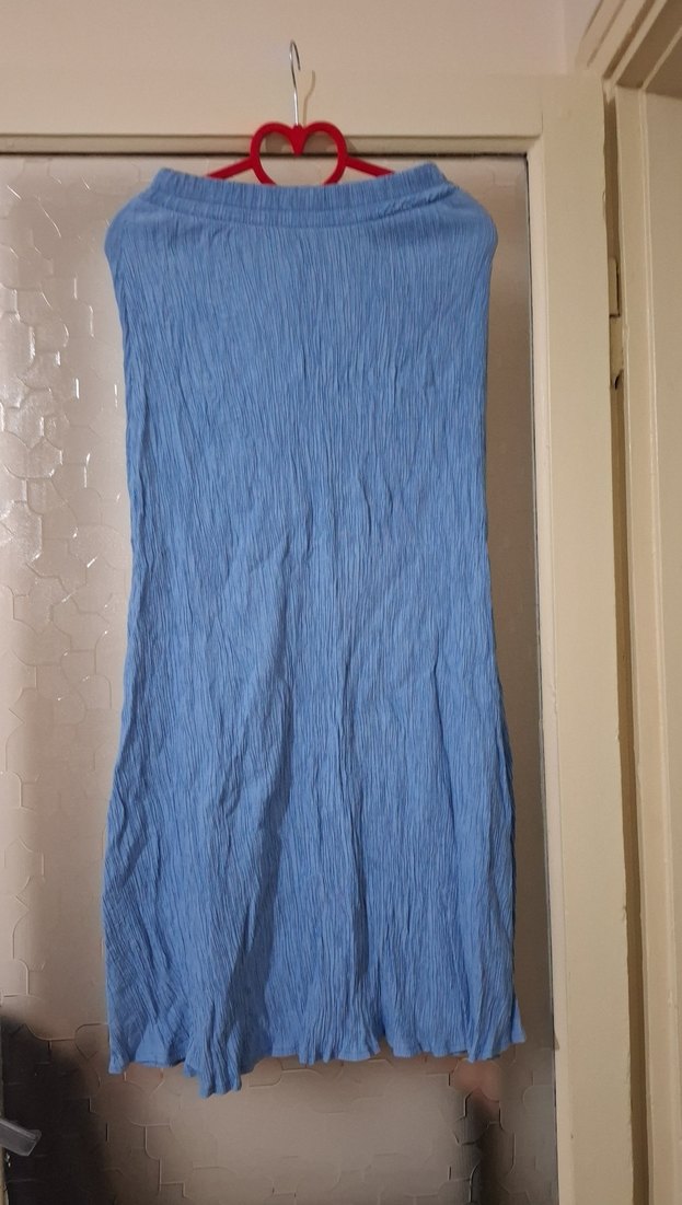 Uzun, bol kesim keten kumaştan pilili etek. Pastel mavi renkte, minimal ve bohem tarzda, günlük kullanıma uygun. 1 kere giyildi.