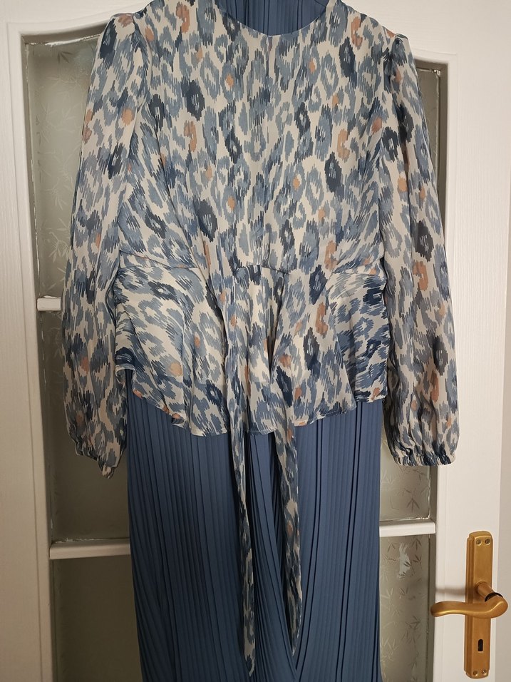 Mavi ve gri tonlarda tie-dye desene sahip, pilili ve bol kesim uzun kollu kadın elbisesi. Yüksek yakalı, sentetik kumaştan, ofis kullanımı için uygundur.