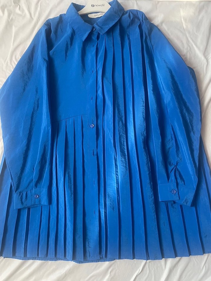 Parlak mavi renkli, pilili uzun kollu kadın gömleği. Yaka detaylı, bol kesim ve uzun boylu, ofis için uygun avant-garde tarzda.