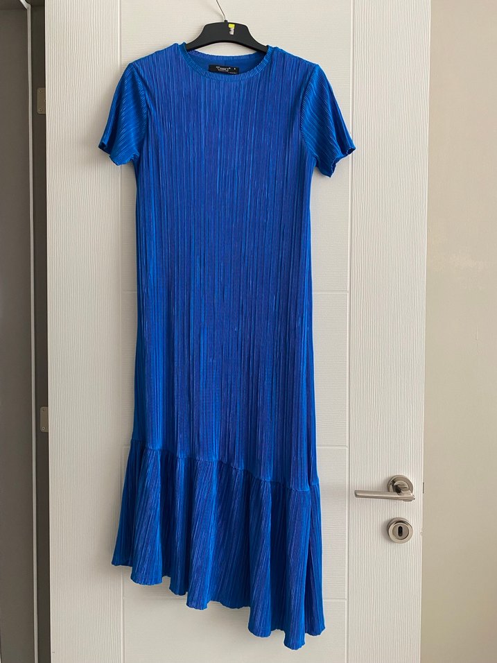 Mavi renkli, piliseli, kısa kollu ve yuvarlak yakalı kadın uzun elbise. Sentetik kumaştan, bol kesim ve minimal tarzda, günlük kullanıma uygundur.