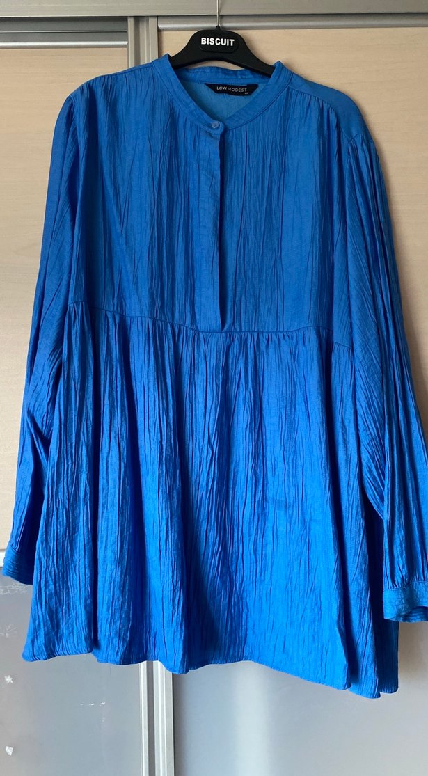 Mavi renkli, keten kumaştan yapılmış, piliseli detaylı ve bol kesim tunik. Yüksek yakalı, uzun kollu ve midi boydadır. Bohem stil için uygundur. Ön arkada ufak lekeleri var çıkarmak için zorlamadım çıkabilir yani 1-2 kere giydim