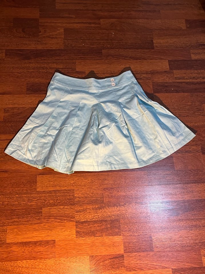 Mavi renkte, piliseli ve bol kesim midi boy denim etek, dış mekan rahat kullanıma uygundur.