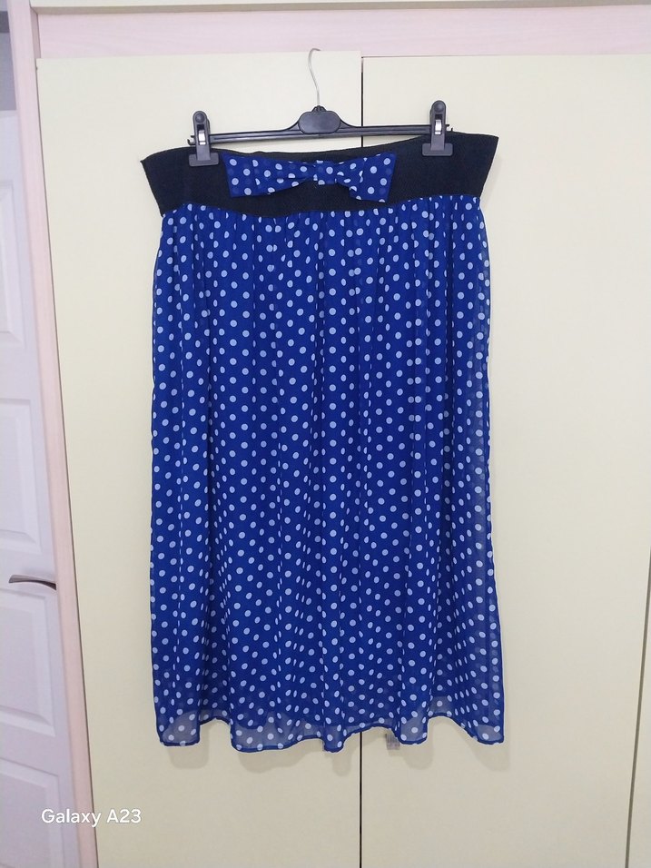 Mavi piliseli midi etek, siyah bel bandı ve fiyonk detayına sahip. Sentetik kumaştan, rahat ve salaş kesim. Günlük sokak stiline uygun.