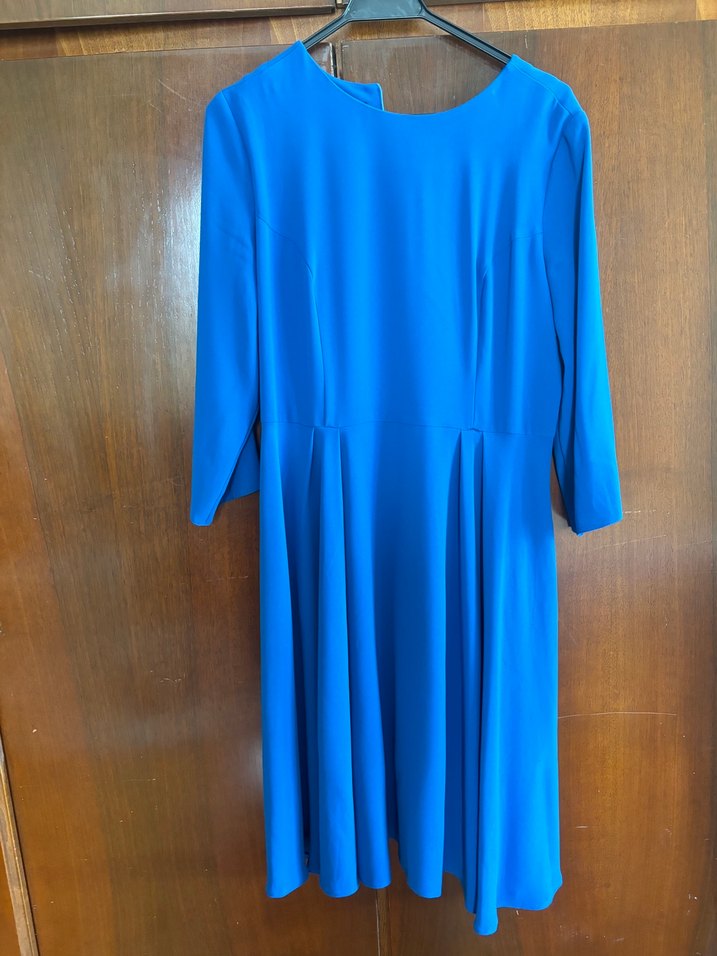 Mavi, uzun kollu, piliseli ve bol kesim midi elbise. İpek gibi parlak kumaştan, yuvarlak yakalı ve ofis kullanımı için uygun. Sayılı kullanılmıştır