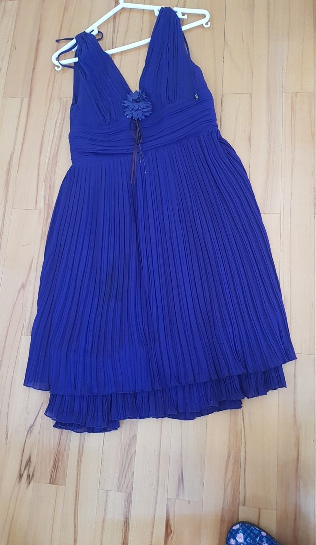 Koyu mavi, piliseli kumaşlı, straplez yaka ve fitted kesim midi elbise. Kolsuz tasarım ve ön kısmında zarif çiçek detayı.