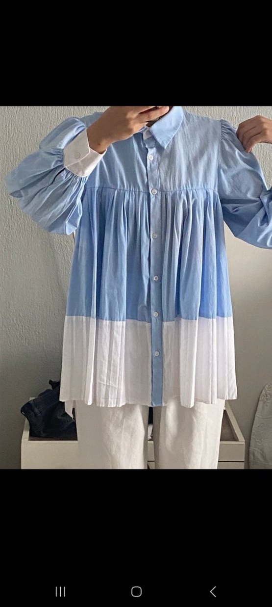 Pamuklu, piliseli detaylı, mavi-beyaz renklerde, yakalı ve uzun kollu salaş midi gömlek. Günlük kullanım için uygundur. Temiz ve sorunu yok. 40 ve 42 beden uyumludur. Kalça kapatıyo. Kumaşı pamukludur son fiyat