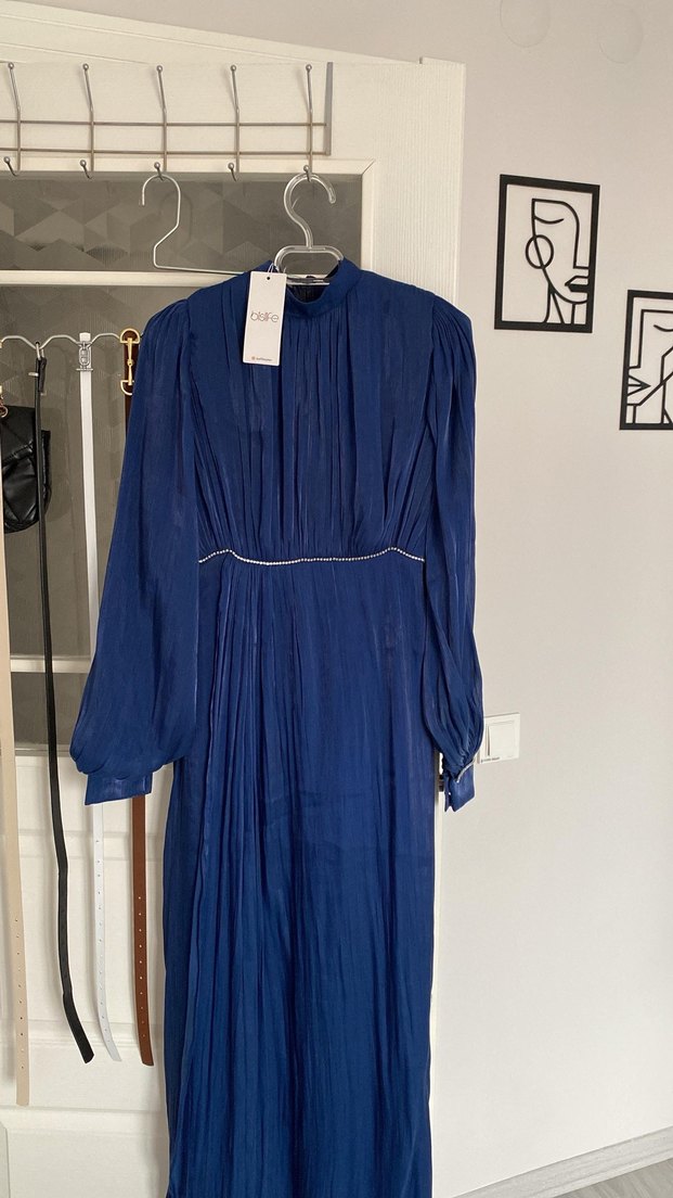 Harika bir kumaşı var giyilmedi etiketli duruyor. 36 beden uyumlu Mavi uzun keten elbise, piliseli ve yüksek yakalıdır. Bol kesim ve askılı kollarıyla bohem ve klasik tarzı birleştirir, ofis kullanımı için uygundur.