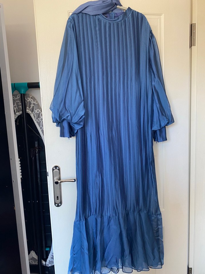 Mavi Piliseli Uzun Keten Elbise