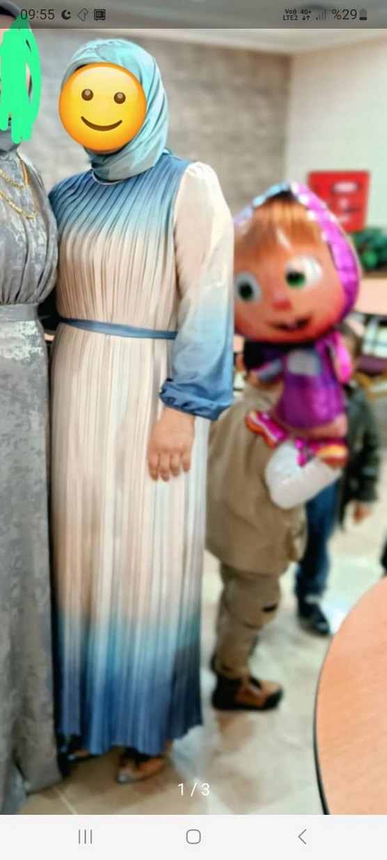 Mavi piliseli uzun elbise, yüksek yakalı ve uzun kollu. Sentetik kumaştan, regular fit ve bağlama desenli, sade ve bohem tarzda, düğün için uygun. eşarpla göndereceğim çok temiz defosuz