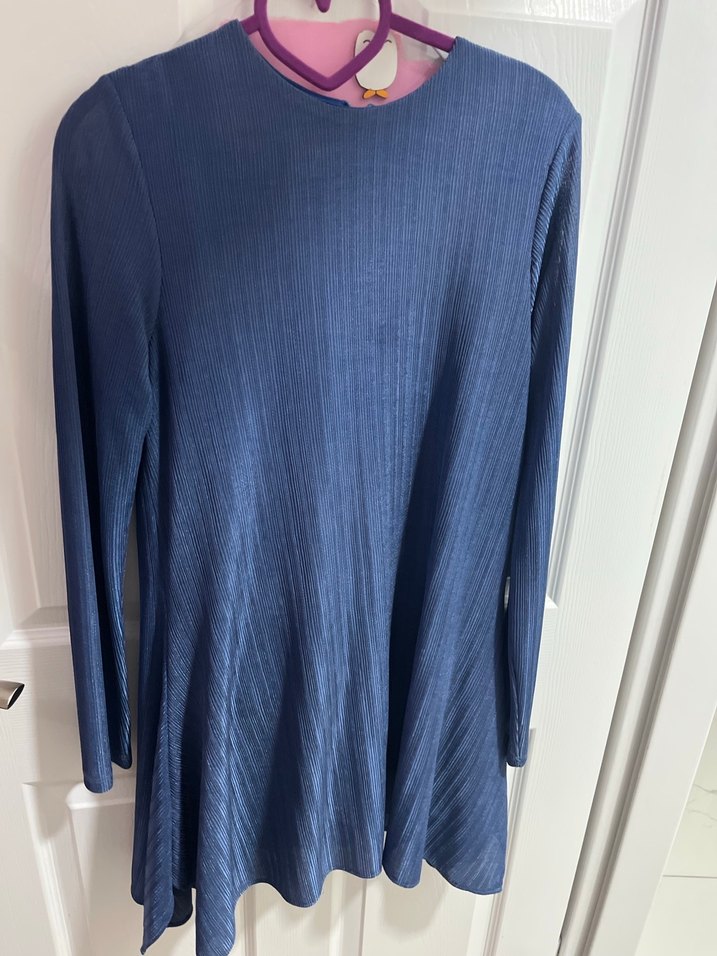 Mavi piliseli detaylı, uzun kollu, yuvarlak yaka ve bol kesim midi uzunlukta kadın tunik ve pantolon . uygun sade tasarım.