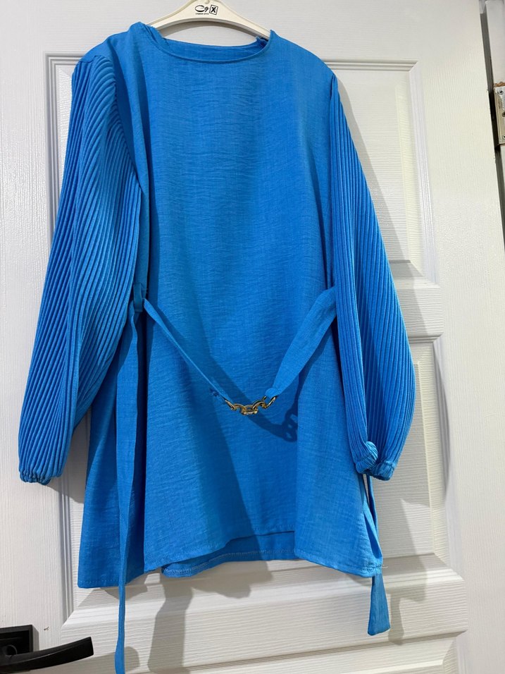 Mavi keten tunikte piliseli uzun kollar, bol ve uzun kesim, yuvarlak yaka bulunur. Renkli, çağdaş ve bohem tarzda bir parça.