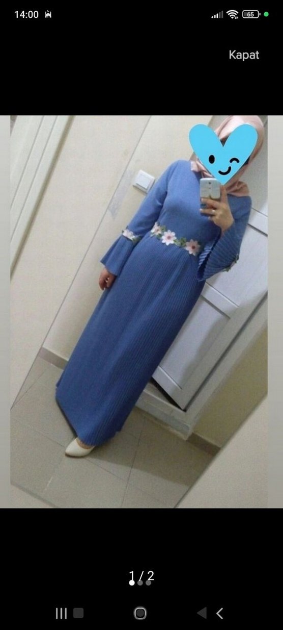 Yüksek yakalı, uzun kollu mavi elbise, yumuşak sentetik kumaştan. Bol kesim, piliseli ve çiçek desenli, günlük tesettür kullanıma uygun.