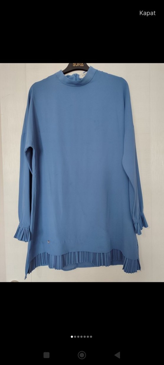 Mavi uzun kollu tunik, manşet ve etek ucu piliseleriyle, yüksek yakalı ve bol kesimdir. Yumuşak sentetik kumaştan üretilmiş, günlük kullanıma uygundur.