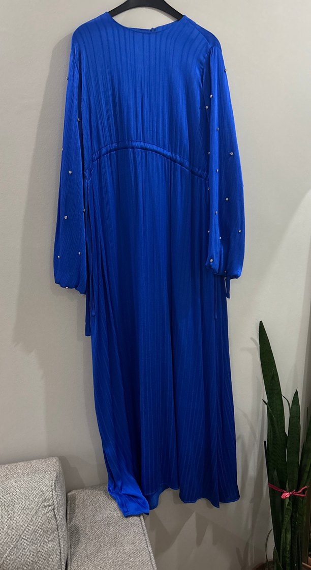 Mavi renkte, uzun elbise. Yuvarlak yakalı, uzun kollu ve küçük süslemelerle detaylandırılmış. Salaş kesimi ve parlak dokusuyla günlük kullanıma uygun.