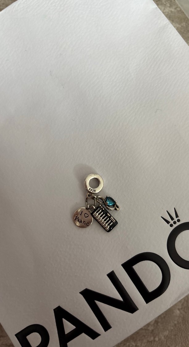 Gri püsküllü, mavi piyano temalı ve baskılı detaylara sahip kadın charm, günlük kullanıma uygun minimalist tarzda.