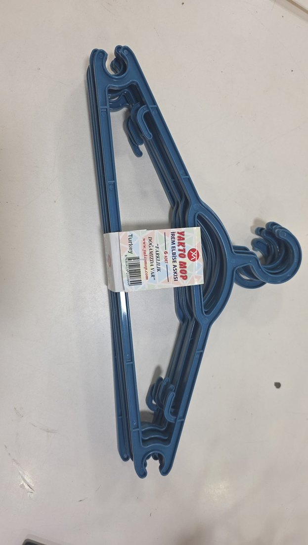 Türkiye'de üretilmiş, kancalı mavi plastik askılar, çeşitli kıyafetler için uygundur.