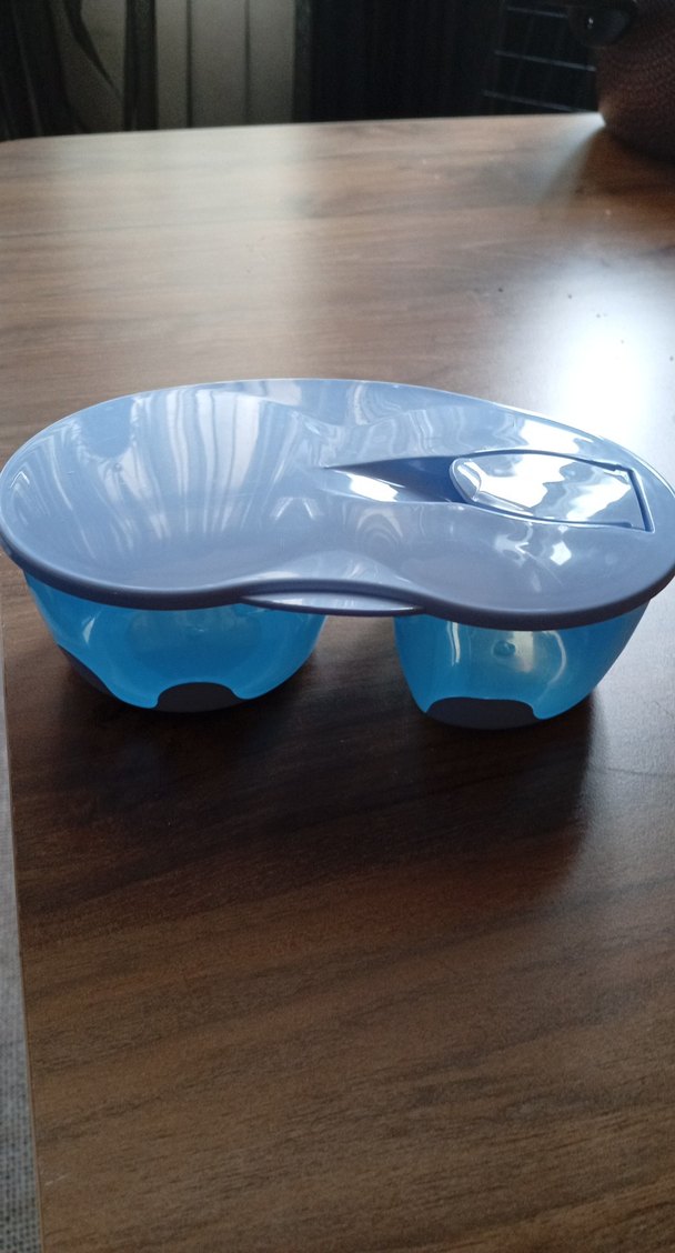 Mavi plastikten yapılmış, iki bölmeli ve kapaklı bebek kabıdır.kasigini kullandim oyuzden yok