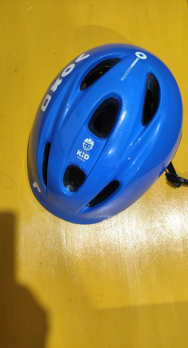 Çocuklar için renkli mavi bisiklet kaskı, plastik gövde ve güvenli tutuş için Velcro bant içerir. Baskılı detaylar ve havalandırma delikleri bulunur. ♂️