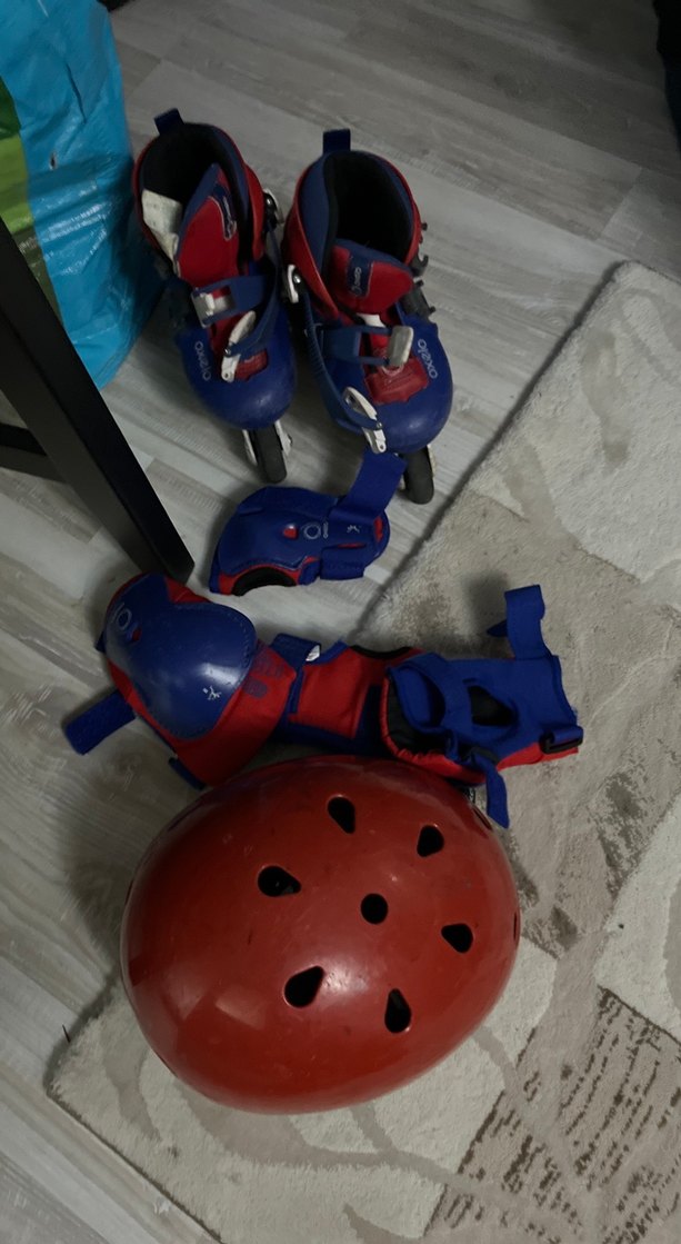Mavi plastik kaykay seti, renkli detaylara ve Velcro kapanışlara sahip. Kask ve koruyucu pedler dahil.