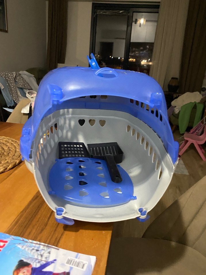 Havalandırma delikleri ve güvenli kilitli kapağı olan mavi plastik taşıma kutusu, küçük hayvanlar için uygundur.