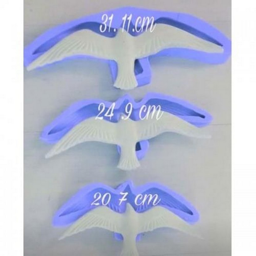 Mavi plastikten yapılmış, 31.11 cm, 24.9 cm ve 20.7 cm ölçülerinde üç farklı kuş şekilli kalıp seti.