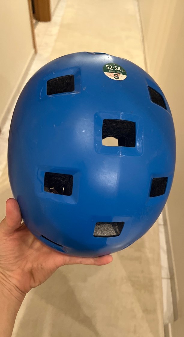 Mavi renkte plastik kask, Velcro bantlı ve çoklu havalandırma deliklerine sahip sade tasarımda.