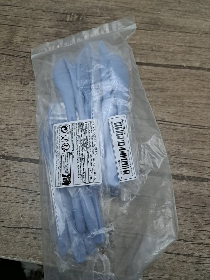 Mavi plastik mutfak gereçleri seti, şeffaf poşet içinde paketlenmiş. Hafif ve çeşitli mutfak işleri için uygundur. Doğum günü de kullanılır