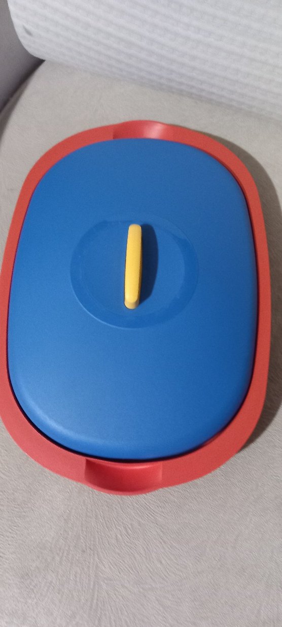 Mavi plastik saklama kabı, kırmızı kenarlık ve sarı kulplu, mutfakta kullanıma uygun.mikrodalga da kullanılabilir