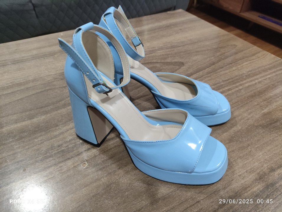 Pastel mavi renkli, tokalı bilek kayışlı, kauçuk tabanlı kadın platform topukludur. Minimalist ve çağdaş tarzda, günlük kullanım için uygundur.
