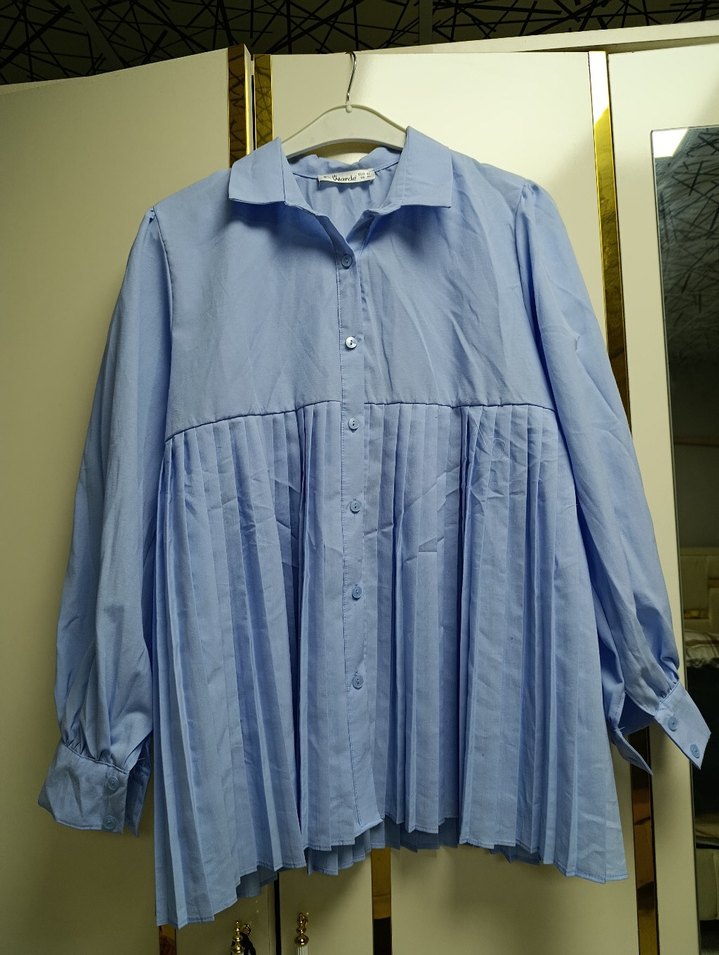 Mavi keten gömlek, yakalı ve uzun kollu, bol kesim ve pliseli detaylarla günlük rahat bir stil sunar. L ve XL bedene uygundur. Atölyeden yeni çıktı hiç giyilmedi ve hiç defosu yoktur.
