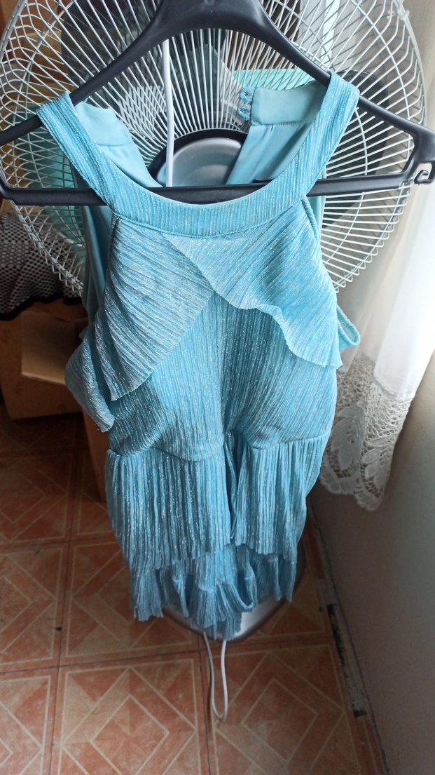Mavi renkli, yüksek yakalı ve askılı kısa pliseli abiye elbise. Bohem tarzı ve fit kesimi ile partiler için uygundur.