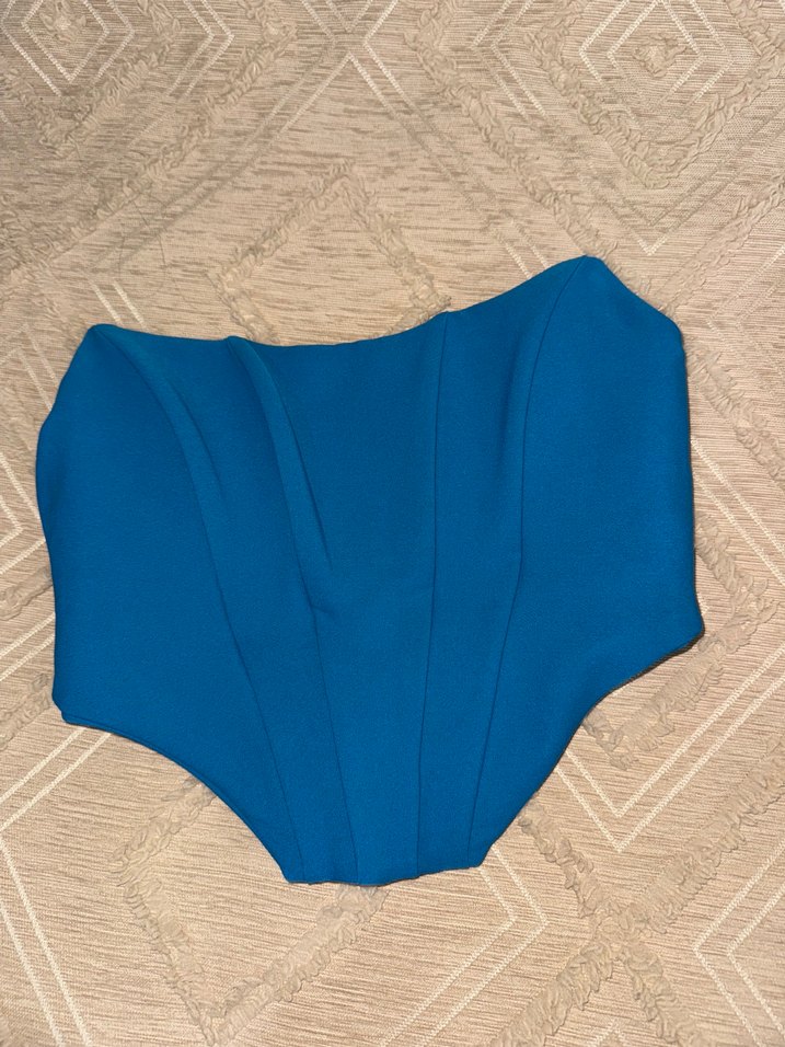 Bu fitted bustiyer, straplez yaka ve pliseli detaylara sahiptir. Hafif mavi renkte sentetik kumaştan üretilmiş, mini boyda ve plaj için uygundur. Avant-garde tarzıyla öne çıkar.