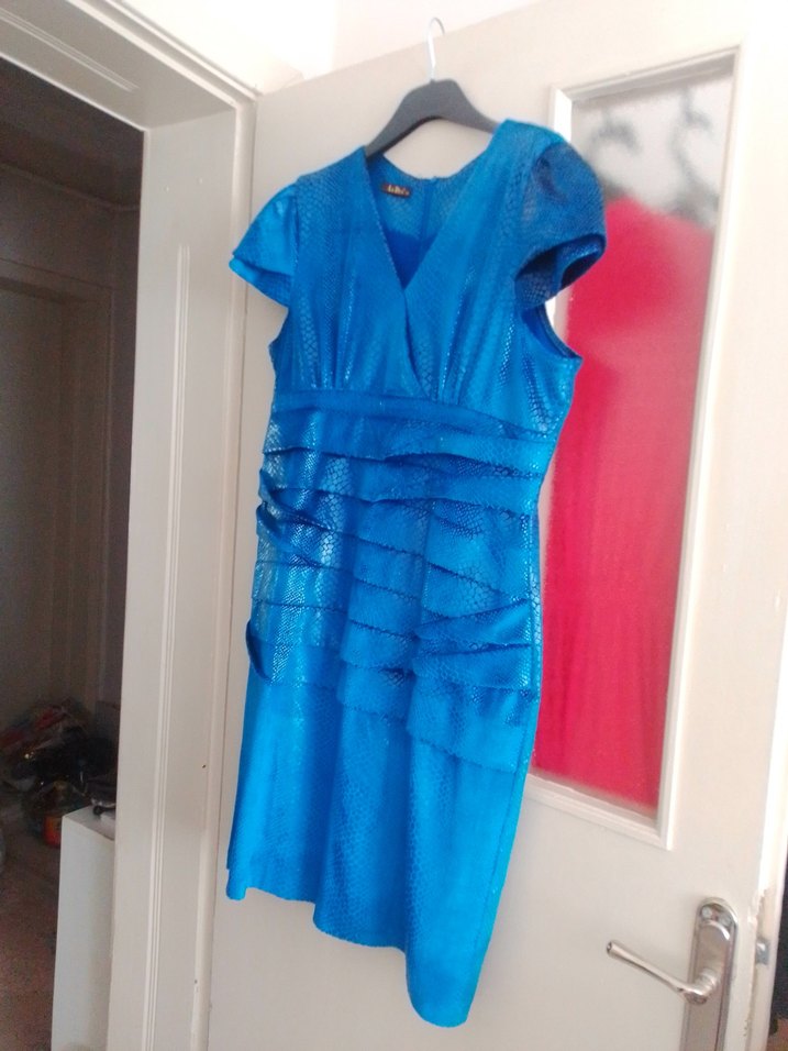 Mavi, v yaka, pliseli ve kolsuz midi elbise. Vücuda oturan kesimiyle günlük şıklık için uygundur. çok tarz 50 beden elbise kumaşı likralı yılan derisi kadifeli çok güzel bir kumaştan çok tarz tasarım astarlı arka fermuarlı abiye elbise günlük özel kullanım La Dea marka 50 beden gece mavisi saks mavi geçişli renk koltuk altından koltuk altına 57 cm boy 104 cm