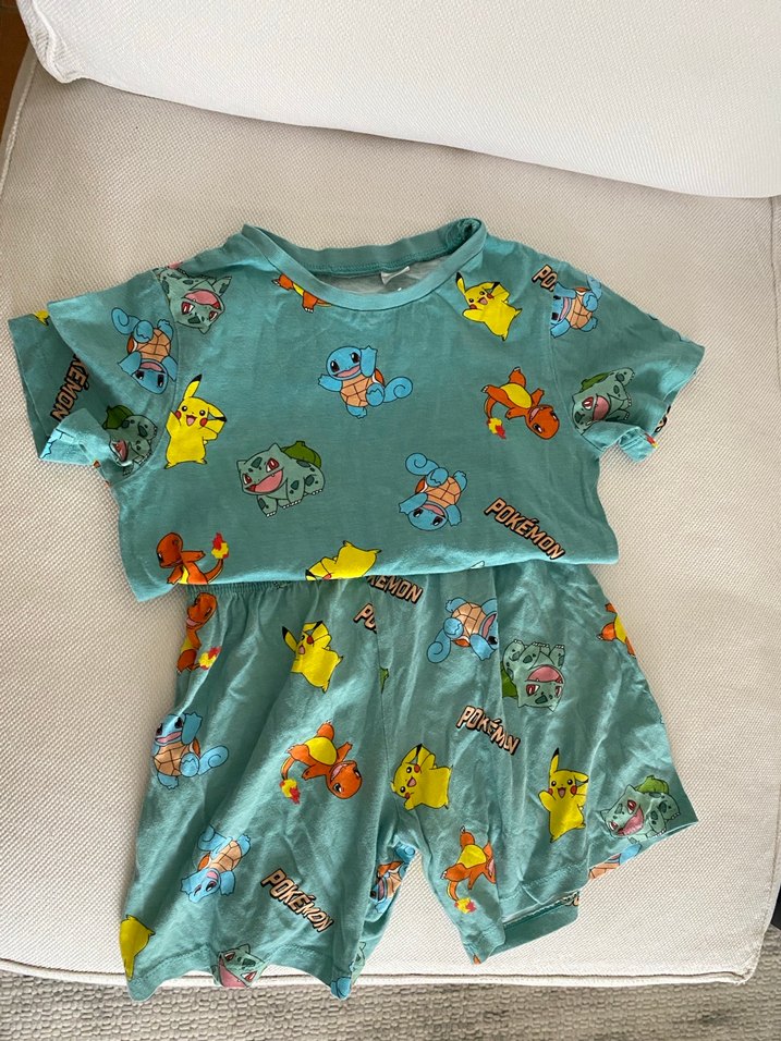 Pastel mavi renkte, Pokémon baskılı kısa kollu bebek takımı. Sentetik kumaştan, pokemon detaylıdır.